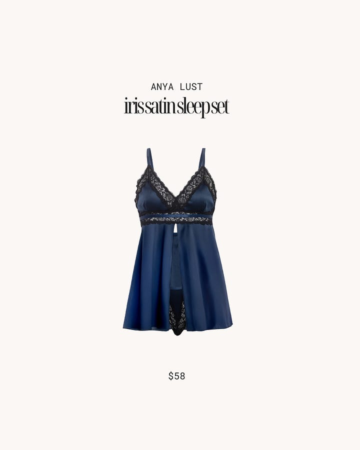 Anya Lust, a Black-owned lingerie brand, is an underrated staple for chic but inexpensive nightwear. This set, a babydoll and a g-string, only comes in midnight blue. Fortunately, the brand has different sets in red, black and baby pink for wear.
